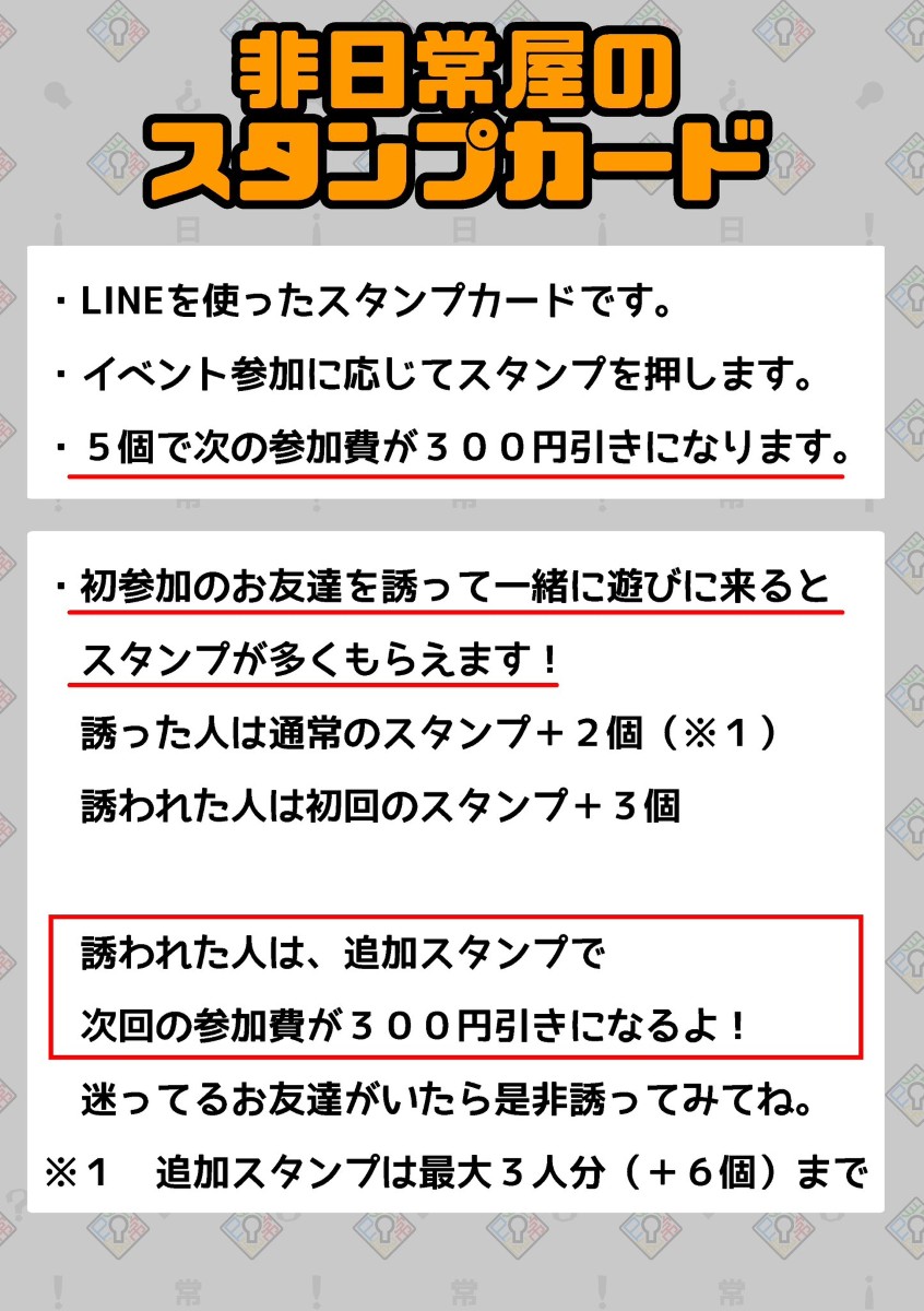 また、非日常屋のイベントに初参加の方を連れてきていただくと、誘った人も誘われた人も追加スタンプがもらえます。