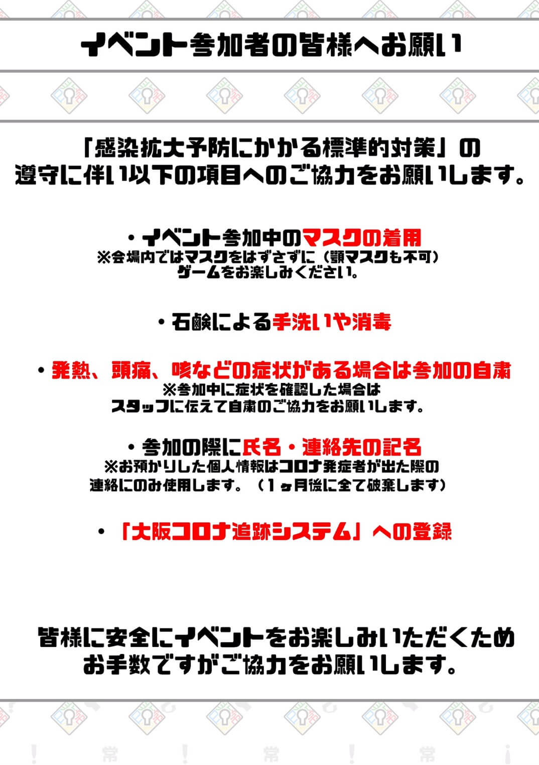 会場にお越しくださるみなさまには、感染症対策の観点およびお借りしている会場の規約より、以下の点にご協力をお願いします。