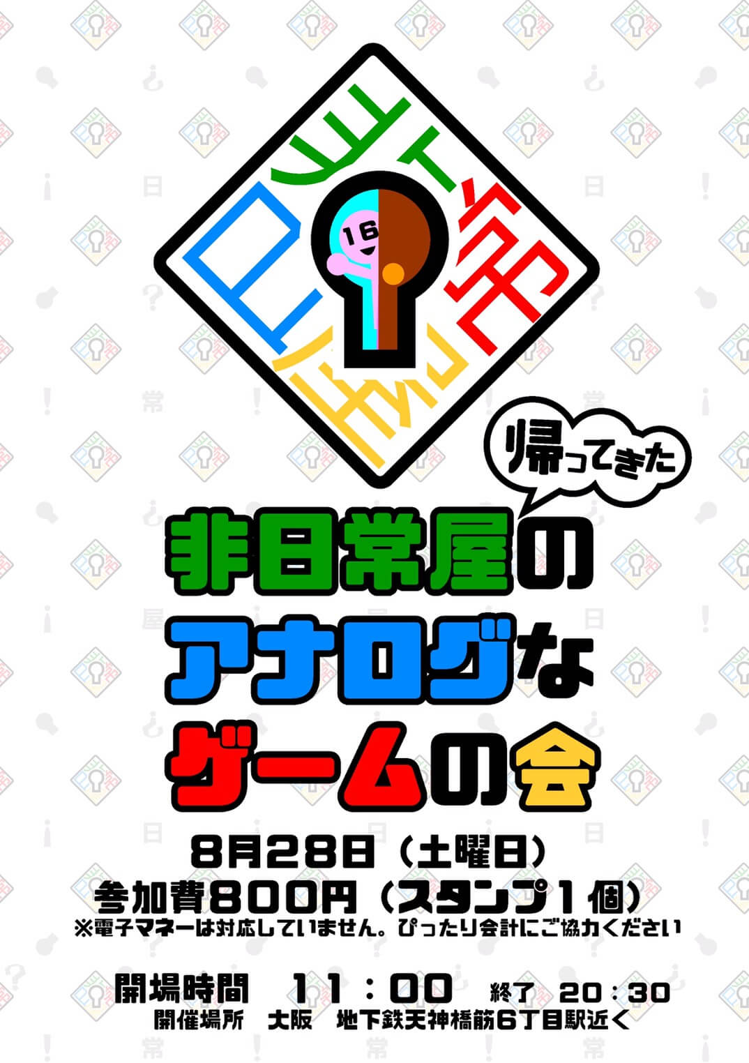 非日常屋が長年お世話になってきた、大阪天六近くの会場に戻っての『帰ってきた非日常屋のアナログなゲームの会』開催でございます。